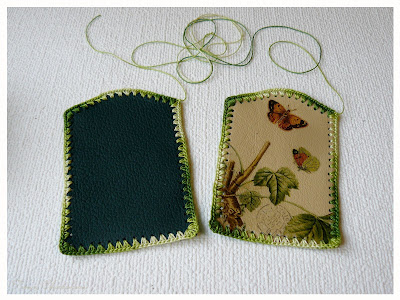 Поверхность кожи я предварительно обезжирила спиртом. Потом аккуратно вырезанные нужные мне части салфетки расположила на заготовке. А затем промазала салфетки клеем ПВА с помощью мягкой синтетической кисти, стараясь расправить все складки и выгнать все пузырьки воздуха. Сразу после приклеивания, пока салфетка влажная, зубочисткой я прошлась по всем отверстиям, которые оказались залеплены салфеткой. И оставила сушиться на полчаса.